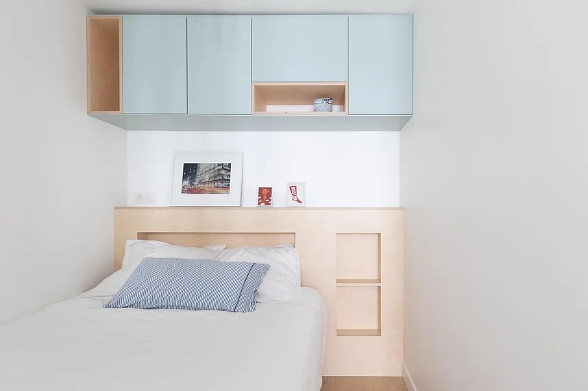 وبالمثل، نظرًا لعدم وجود مساحة أرضية كافية لتثبيت طاولة بجانب السرير، تم تركيب لوح رأسي، مصنوع أيضًا خصيصًا، مع منافذ مدمجة للتخزين الإضافي. كل هذا بألوان فاتحة لتكبير الغرفة، سنتحدث عنه في النصيحة التالية!